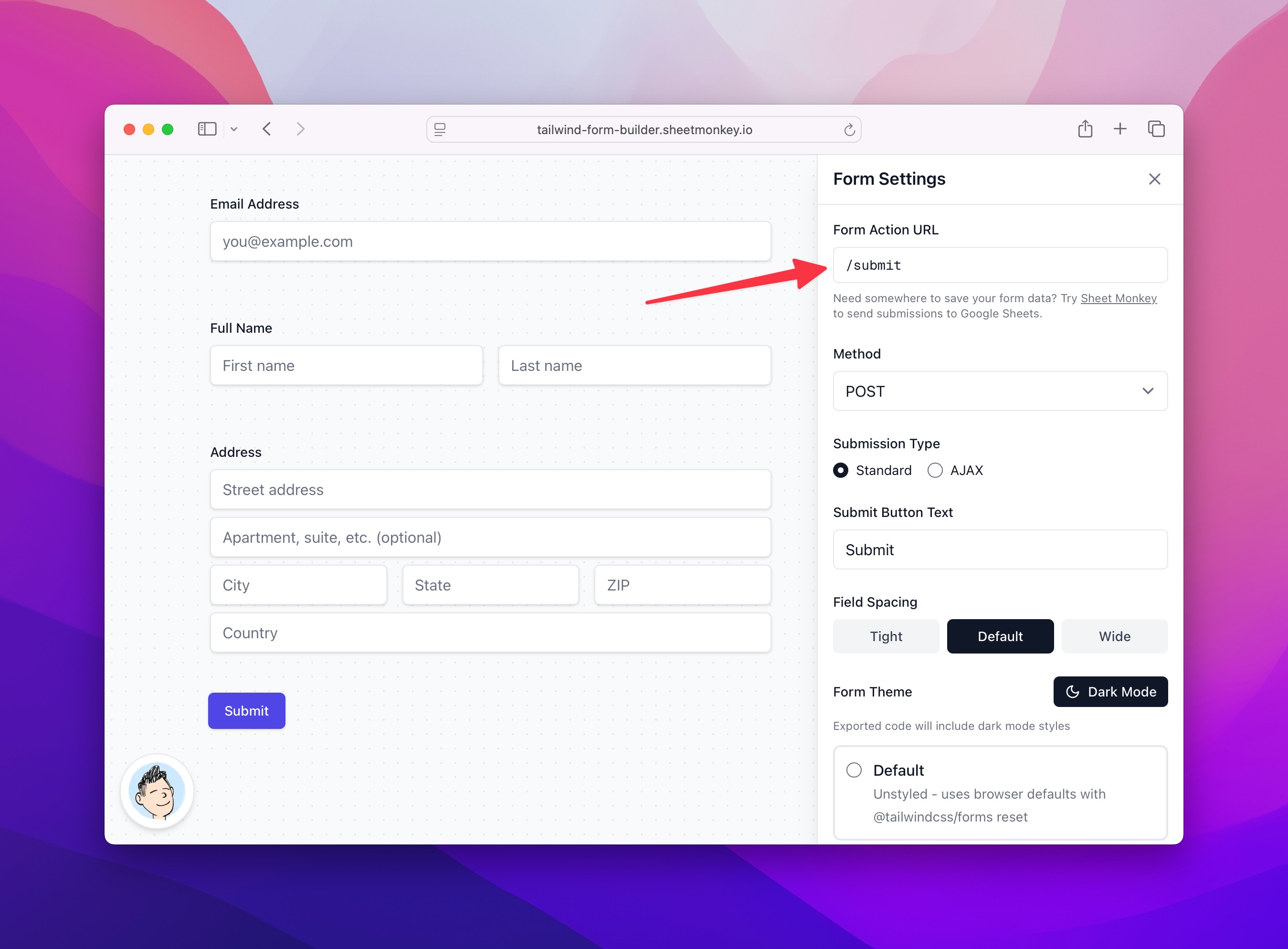 In the Form Settings panel, paste your Sheet Monkey form action URL into the "Form Action" field. Export your form code and add it to your website.