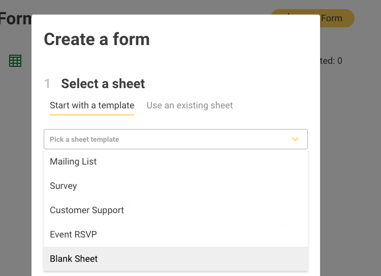 Start by logging into the Sheet Monkey dashboard and create a form. If you don't know what form to start with, we recommend picking the "Blank Form" template and Sheet Monkey will automatically fill out the data once you start submitting data.